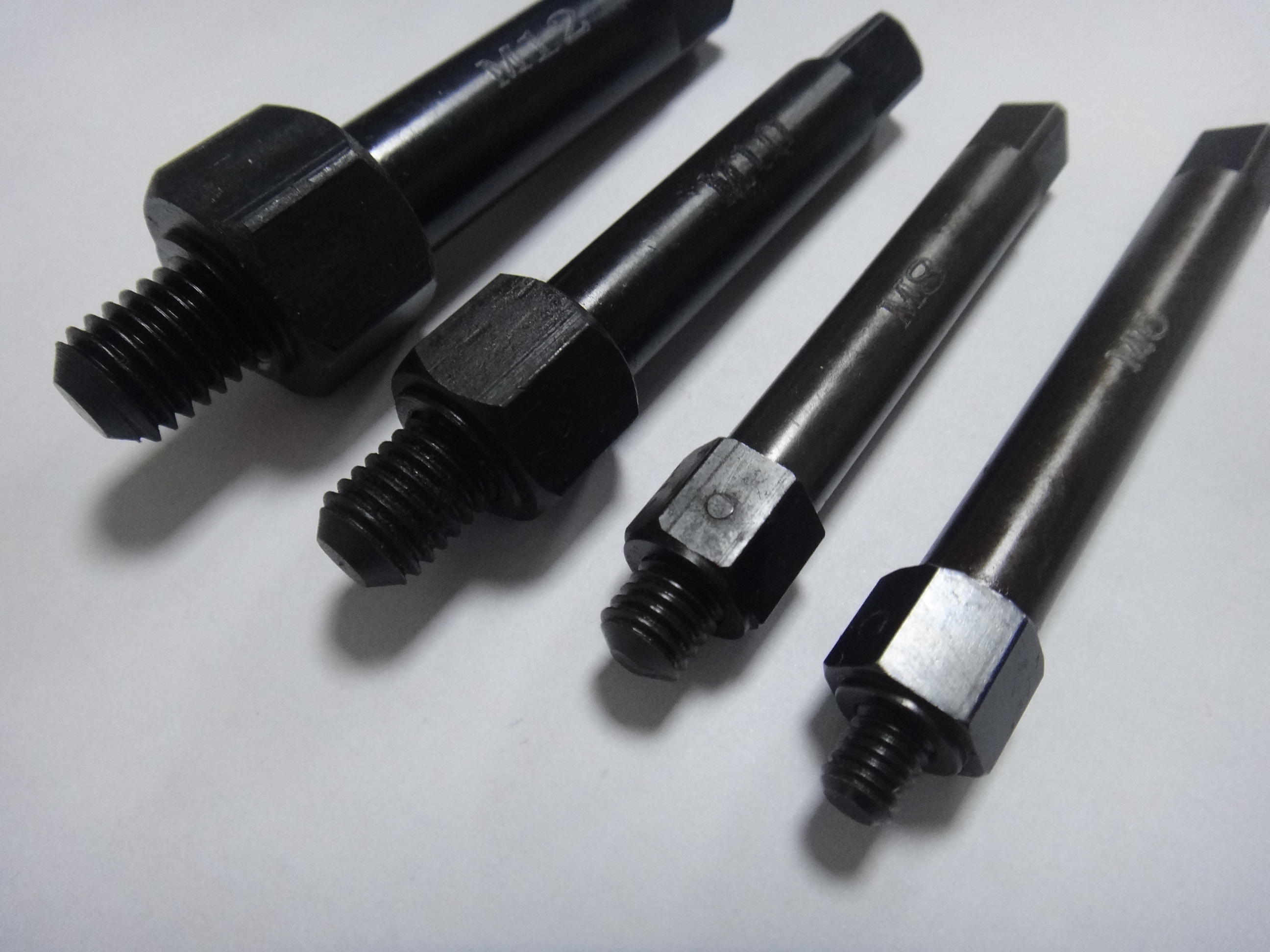 對有折斷槽的鋼絲螺套,旋入螺孔后應將安裝柄去除,需用去柄工具。通孔時,要將鋼絲螺套安裝柄折斷,一般用沖斷器對準安裝柄,用 200g 左右的榔頭猛打一下即可去除,對于 M18×2.5 以上的粗牙鋼絲螺套和 M14×1.25 以上的細牙鋼絲螺套 , 用尖嘴鉗上下彎曲安裝柄就能折斷,然后將斷下來的安裝柄從螺孔中取出即可。